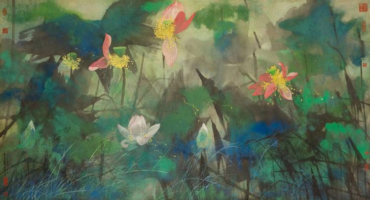 為了展現(xiàn)中華名族的蘇繡文化,蘇繡的作品開(kāi)始進(jìn)入國(guó)家政治場(chǎng)所,在人民大會(huì)堂有蘇繡的作品,蘇繡也不僅一次的作為外交禮品贈(zèng)與國(guó)外元首。隨著香港回歸祖國(guó),外交部駐港機(jī)構(gòu)也需要裝飾布置。為了體現(xiàn)我國(guó)的優(yōu)秀傳統(tǒng)文化,有關(guān)部門決定采用四大名繡之一的蘇繡作為該機(jī)構(gòu)貴賓室內(nèi)的陳設(shè)品。選用的畫(huà)稿是由中央工藝美術(shù)學(xué)院教授袁運(yùn)甫設(shè)計(jì)的《彩墨荷塘》,這幅畫(huà)采用虛實(shí)亂針繡和平針中各種針?lè)ㄏ嘟Y(jié)合的多種針?lè)?,既?jiàn)粗獷筆墨,又有細(xì)致刻畫(huà),精心繡制成雙面異色亂針繡《彩墨荷塘》,高1.1米。寬2.3米。原作以大膽老辣的中國(guó)傳統(tǒng)潑墨和西洋絢麗濃艷的色彩,描繪了一副生機(jī)黯然的荷塘景色,繡工使用了五百多種色線,真實(shí)地反映了原作的精髓,既強(qiáng)調(diào)了光色效果,又很好地處理了虛實(shí)搭配。繡面上粉紅色、白色的荷花亭亭玉立,金黃色花蕊中幾支嫩綠色的蓮蓬清香遠(yuǎn)溢,碧綠的田田荷葉在深藍(lán)底色的烘托下色彩交相滲透,枝干、細(xì)草、慈姑葉有的掩映在荷葉中,有的錯(cuò)落有致地呈現(xiàn)在荷葉叢間,富有生氣地展示了仲夏荷塘的清麗之美。這還是至今最大的雙面繡亂針作品。