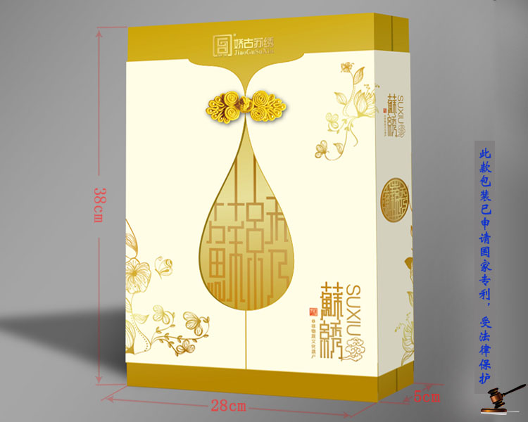 今年嬌古蘇繡又在行業(yè)內(nèi)將產(chǎn)品包裝進(jìn)行了更新?lián)Q代,精美的蘇繡工藝品應(yīng)該配有設(shè)計(jì)的包裝,這樣才能彰顯其獨(dú)特藝術(shù)價(jià)值,由專(zhuān)業(yè)的設(shè)計(jì)公司為嬌古蘇繡設(shè)計(jì)了這款包裝,產(chǎn)品一經(jīng)使用,客戶(hù)的認(rèn)可度高,為此嬌古蘇繡還特為此款原創(chuàng)設(shè)計(jì),受到法律的保護(hù)。 |