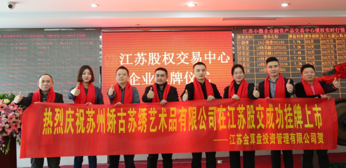 ?? 2016年12月9日,蘇州嬌古蘇繡藝術(shù)品有限公司掛牌上市儀式在江蘇股交中心隆重舉行。簡稱“嬌古蘇繡”,股權(quán)代碼“690901”。伴隨著莊重而響亮的鑼聲,嬌古邁出了跨越式的一步。???? ?? 就嬌古蘇繡掛牌成功,公司董事長張奇?zhèn)ハ壬硎尽肮纠響?yīng)將完善企業(yè)治理機(jī)構(gòu),提升企業(yè)競爭力放在首位,不辜負(fù)資本市場對嬌古的認(rèn)可及支持。這也是公司一個飛躍式進(jìn)步,一個重要里程碑。嬌古員工們將其作為強(qiáng)大的動力,更好、更快的為廣大客戶服務(wù)。規(guī)范和健全企業(yè)發(fā)展機(jī)制,是我們的目標(biāo)。但我們相信,掛牌成功,對企業(yè)的規(guī)范化、影響力有著不可小覷的力量。在此,我僅代表全體公司人員,感謝股交中心長期以來的支持與信任,感謝所有工作人員辛勤的付出!”