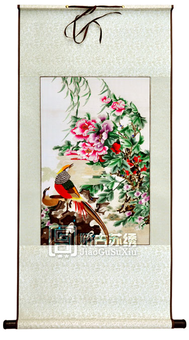 牡丹蘇繡軟裱畫,帶軸天地桿手工刺繡畫,國際友人喜愛禮物