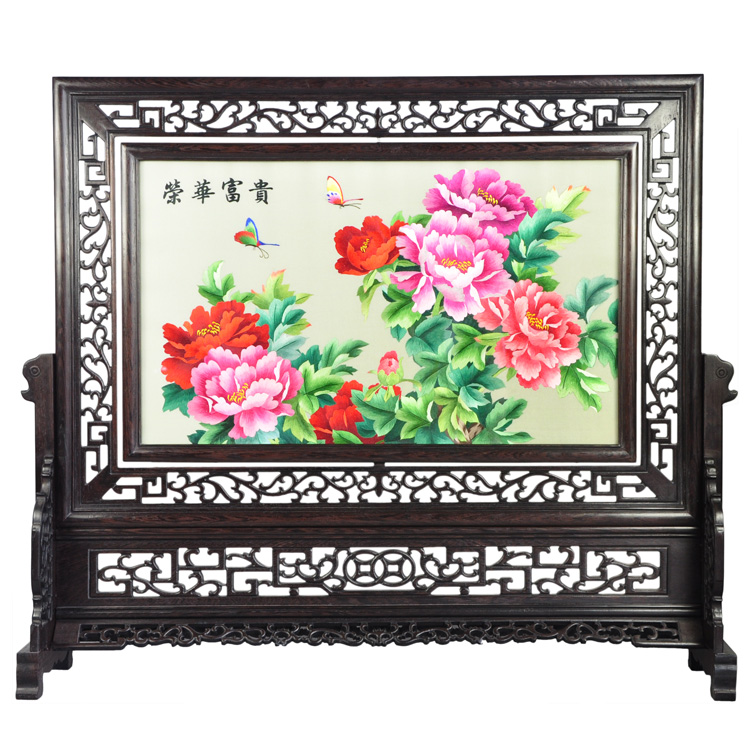 蘇繡富貴榮華擺件臺(tái)屏仿古實(shí)雕木架刺繡品臥室中式擺件
