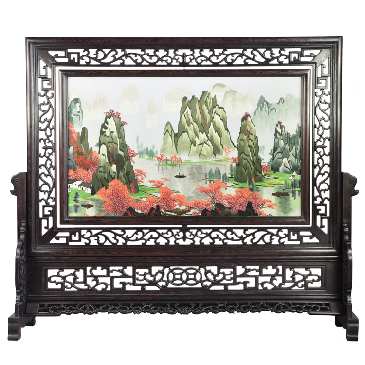 山水蘇繡漓江山水刺繡成品雞翅木雙面繡江南手工藝品創(chuàng)意擺件