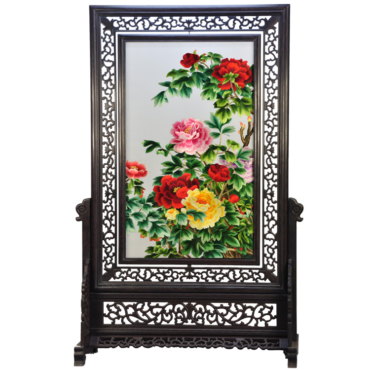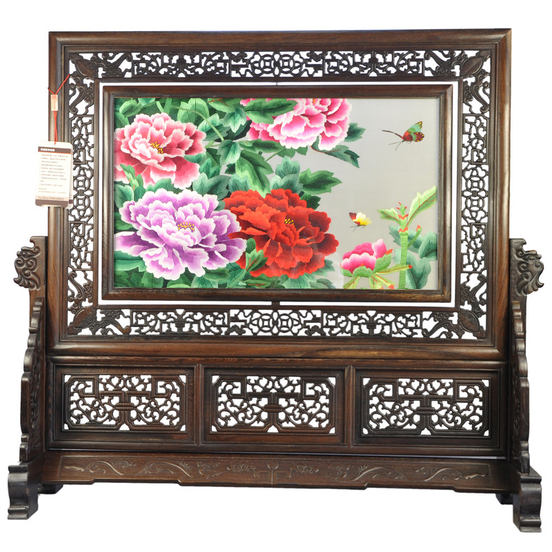 蘇繡牡丹雞翅木豎架客廳擺件創(chuàng)意特色工藝品送外賓禮物民間工藝手工藝品