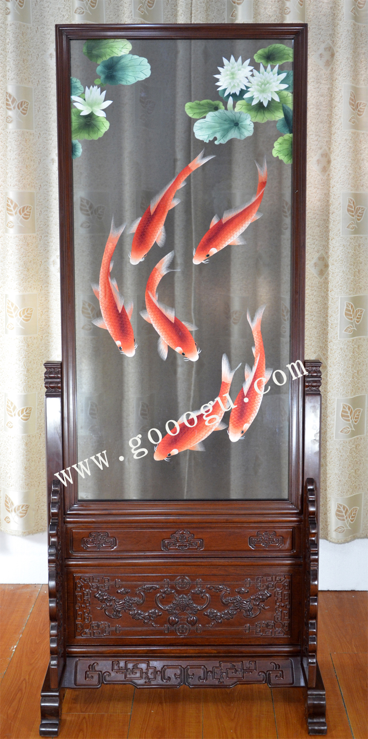 蘇繡玄關(guān)屏風(fēng) 蓮花魚 紅木框架 純手工