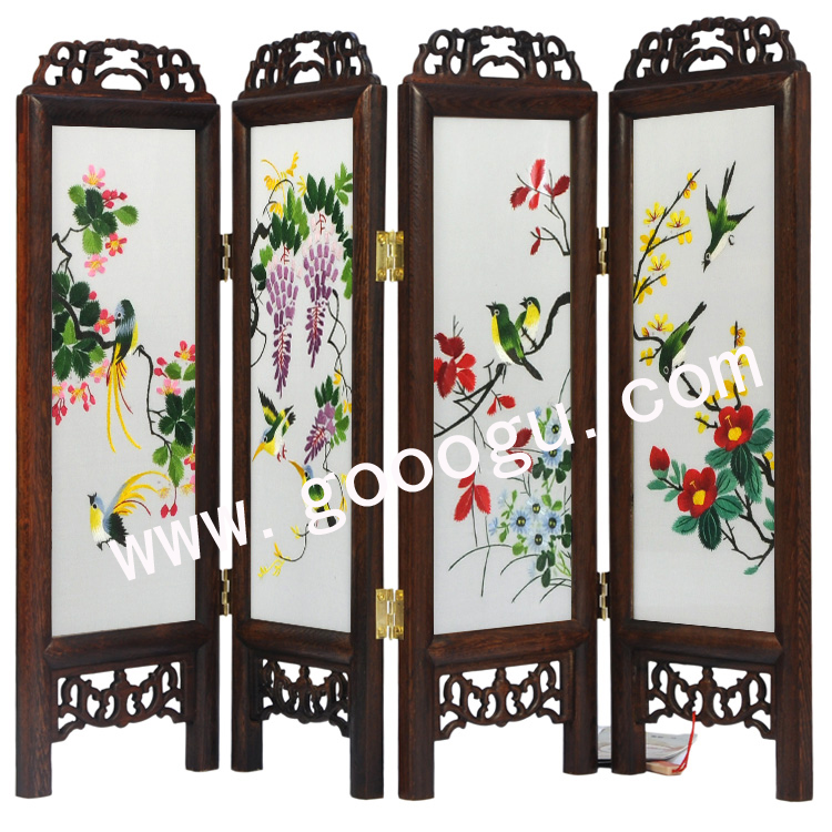 產(chǎn)品名稱:四扇雙面小屏風(fēng)(雙面繡) (作品代碼:SSZ-080) 產(chǎn)品規(guī)格:每扇圖案尺寸:寬10CM,高25CM 每扇外框整體尺寸寬12CM,高38CM 產(chǎn)品工藝:蘇州繡娘手工刺繡 產(chǎn)品材質(zhì):真絲面料+桑蠶絲線+玻璃+雞翅木 產(chǎn)品包裝:錦盒禮品裝 嬌古出廠價(jià):880元/組 市場零售參考價(jià):1680-2280元左右 最小起訂量:10件----廠家直銷,可當(dāng)天發(fā)貨(可混配圖案) 產(chǎn)品描述:【四扇雙面繡折疊小屏風(fēng)】為蘇州繡娘純手工刺繡而成,木框?yàn)殡u翅木打磨而成,具有無污染易攜帶等特性。圖案有花卉(牡丹,梅花,荷花,蘭花等),花鳥,動物(熊貓,老虎,魚等),山水,風(fēng)景,名家字畫等。圖案多達(dá)一百多種,有古色古香的,有現(xiàn)代氣息的,高貴典雅,是贈送客人的特色禮品之一。 注:此款四扇雙面繡折疊小屏風(fēng)要求整體四扇圖案構(gòu)成一幅整體,整體意境要求簡單但不乏傳統(tǒng)文化內(nèi)涵。比較適宜室內(nèi)居家或辦公等裝飾場所,是件值的收藏的蘇繡作品,也是贈送親朋好友的特色禮品之一。(可根據(jù)需要加企業(yè)LOGO等)。 此款典型客人:上海采埃孚轉(zhuǎn)向機(jī)公司等