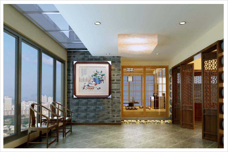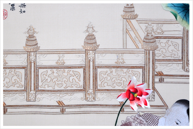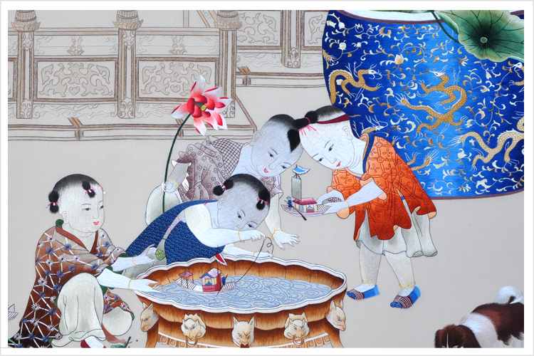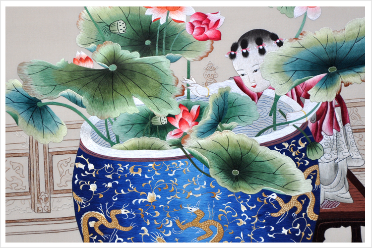 【品 牌】:嬌古 (作品代碼 D-1040) 【品 名】:傳宋人畫(huà)子孫和合圖裝飾畫(huà)(手工蘇繡) 【品 質(zhì)】:1-2絲刺繡 (蘇繡小知識(shí):1根蘇繡絲線(xiàn)可分為16絲,中檔刺繡皆為10絲所繡,中高檔刺繡皆為6-8絲,高檔刺繡皆為4-6絲,精品刺繡皆為1-4絲) 【尺 寸】:畫(huà)心尺寸80*80cm 整體尺寸113*113cm 【產(chǎn)品工藝】:手工刺繡 【絲線(xiàn)材質(zhì)】:蠶絲線(xiàn) 【用 途】:政府禮品、外賓禮品、生日禮物、賀壽禮品、領(lǐng)導(dǎo)升遷、出國(guó)禮品等等。 【出廠(chǎng)價(jià)格】:45000元 【文物原屬】故宮舊藏 【文物現(xiàn)狀】現(xiàn)藏臺(tái)北故宮博物院 【作品介紹】:此圖繪三名孩童在宮廷花園中戲水船,五爪龍紋藍(lán)彩瓷缸種植的粉紅荷花、嫩綠荷葉正盛開(kāi)著。主題擷取童子荷花的諧音而成子孫和合之寓意,白胖活潑的嬰戲圖透露出追求福多子多的吉祥意義。畫(huà)面中的長(zhǎng)方凳座面是棕藤編織物,腿之間飾壼門(mén)券口,下為如意形腳。畫(huà)中除柳樹(shù),另有月季、嫩竹傍石而生,亦有四季平安的吉祥涵義。 本幅舊題為宋人所作,若由其孩童精致服飾、家具器用及庭院欄桿裝飾物之形制來(lái)看,應(yīng)為明代中期宮廷畫(huà)師所繪。 細(xì)節(jié)圖
