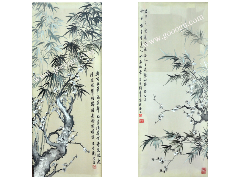 【產(chǎn)品名稱】:紅木蘇繡屏風(fēng)---梅竹(雙面繡) (作品代碼:ZP-1004) 【產(chǎn)品規(guī)格】:圖案尺寸寬35CM每扇,高90CM每扇 外框整體尺寸寬60cm每扇,高210cm每扇 【產(chǎn)品工藝】:手工刺繡 【產(chǎn)品材質(zhì)】:真絲面料+紅木框+桑蠶絲線+玻璃 【產(chǎn)品包裝】:木箱包裝,用海綿包扎,確保運(yùn)輸安全 【出廠價】:56800元 【產(chǎn)品運(yùn)輸】:我司負(fù)責(zé)發(fā)往客戶指定地點(diǎn),蘇州附近城市可送貨上門! 【產(chǎn)品說明】:此款紅木雙面繡折疊屏風(fēng),是由蘇州工藝師耗時數(shù)個月精心手工刺繡而成,刺繡圖案為中國傳統(tǒng)的梅花和竹子,繡工精細(xì),顏色搭配均勻,整體給人舒適,愜意之感,紅木框架做工精細(xì)手工打磨,是蘇繡屏風(fēng)中的經(jīng)典作品。是企事業(yè)大堂或大廳的重要裝飾品之一!歡迎親臨嬌古蘇繡展示廳觀看實(shí)物! 【作品欣賞】 .jpg)