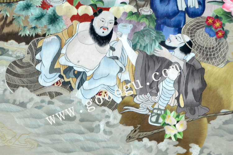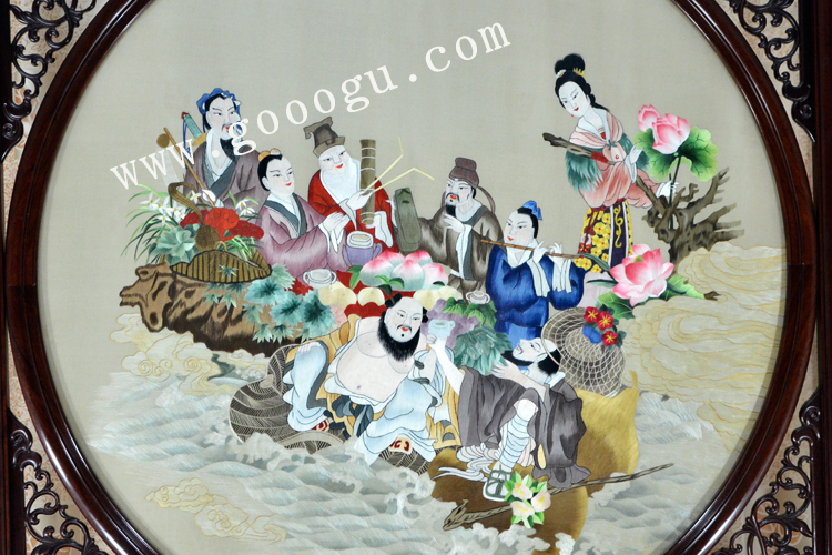 【產(chǎn)品名稱】:蘇繡屏風---八仙過海(雙面繡) (作品代碼:P-1067) 【產(chǎn)品規(guī)格】:圖案尺寸直徑為100cm的圓 外框整體尺寸寬170cm,高215cm 【產(chǎn)品工藝】:手工刺繡 【產(chǎn)品材質(zhì)】:真絲面料+紅木框+桑蠶絲線+玻璃 【產(chǎn)品包裝】:木箱包裝,用海綿包扎,確保運輸安全 【出廠價】:68000元 【產(chǎn)品運輸】:我司負責發(fā)往客戶指定地點,蘇州附近城市可送貨上門! 【產(chǎn)品說明】:此款雙面繡屏風,是由蘇州工藝師耗時五個月精心手工刺繡而成,刺繡圖案以中國傳統(tǒng)文化中八仙過海為題材繡工精細,人物形象刻畫的細致入微,表情更是神態(tài)不一,顏色搭配均勻過渡自然,整體給人舒適,愜意之感,屏風的框架選用紅木為料,此款蘇繡屏風適合企事業(yè)大堂或大廳的裝飾!歡迎親臨嬌古蘇繡展示廳觀看實物! 【作品欣賞】 .jpg)