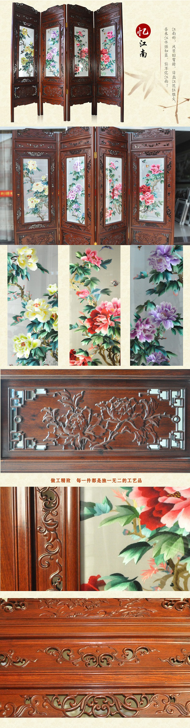 【產(chǎn)品名稱】:四扇牡丹屏風(fēng)(雙面繡) (作品代碼:zp-1501) 【產(chǎn)品規(guī)格】:圖案尺寸每扇寬度35cm,高度90cm 外框整體尺寸寬60cm,高205cm 【產(chǎn)品工藝】:手工刺繡 【產(chǎn)品材質(zhì)】:真絲面料+紅木+桑蠶絲線+玻璃 【產(chǎn)品包裝】:木箱包裝,用海綿包扎,確保運輸安全 【出廠價】:39800元 【產(chǎn)品運輸】:我司負(fù)責(zé)發(fā)往客戶指定地點,蘇州附近城市可送貨上門! 【產(chǎn)品說明】:牡丹雙面繡折疊屏風(fēng),是由蘇州工藝師耗時數(shù)個月精心手工刺繡而成,刺繡圖案以牡丹花為題材繡工精細(xì),顏色搭配均勻過渡自然,屏風(fēng)的框架選用進口的緬甸紅木為料,是蘇繡屏風(fēng)中的珍稀作品。是居家和辦公的重要裝飾品之一!歡迎親臨嬌古蘇繡展示廳觀看實物!
