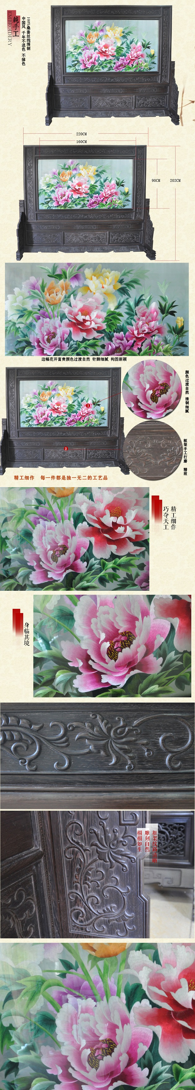 【產(chǎn)品名稱】:花香爭(zhēng)艷(雙面繡) (作品代碼:p-1524) 【產(chǎn)品規(guī)格】:圖案尺寸寬度160cm,高度90cm 外框整體尺寸寬220cm,高202cm 【產(chǎn)品工藝】:手工刺繡 【產(chǎn)品材質(zhì)】:真絲面料+雞翅木+桑蠶絲線+玻璃 【產(chǎn)品包裝】:木箱包裝,用海綿包扎,確保運(yùn)輸安全 【出廠價(jià)】:22800元 【產(chǎn)品運(yùn)輸】:我司負(fù)責(zé)發(fā)往客戶指定地點(diǎn),蘇州附近城市可送貨上門! 【產(chǎn)品說(shuō)明】:花香爭(zhēng)艷雙面繡屏風(fēng),是由蘇州工藝師耗時(shí)數(shù)個(gè)月精心手工刺繡而成,刺繡圖案以國(guó)花牡丹為題材繡工精細(xì),簡(jiǎn)約大方,顏色搭配均勻過(guò)渡自然,屏風(fēng)的框架選用進(jìn)口的雞翅木為料,是蘇繡屏風(fēng)中的珍稀作品。是居家和辦公的重要裝飾品之一!歡迎親臨嬌古蘇繡展示廳觀看實(shí)物! .jpg)