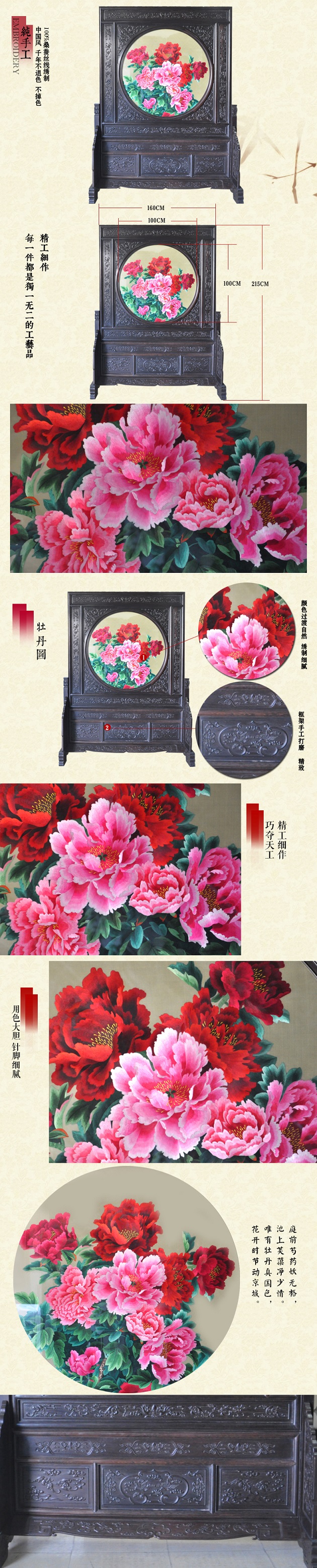 【產(chǎn)品名稱】:牡丹(雙面繡) (作品代碼:p-1514) 【產(chǎn)品規(guī)格】:圖案尺寸100cm的圓 外框整體尺寸寬160cm,高215cm 【產(chǎn)品工藝】:工刺繡 【產(chǎn)品材質(zhì)】:真絲面料+雞翅木+桑蠶絲線+玻璃 【產(chǎn)品包裝】:木箱包裝,用海綿包扎,確保運(yùn)輸安全 【出廠價】:24000元 【產(chǎn)品運(yùn)輸】:我司負(fù)責(zé)發(fā)往客戶指定地點(diǎn),蘇州附近城市可送貨上門! 【產(chǎn)品說明】:牡丹雙面繡屏風(fēng),是由蘇州工藝師耗時數(shù)個月精心手工刺繡而成,刺繡圖案以國花牡丹為題材繡工精細(xì),簡約大方,顏色搭配均勻過渡自然,屏風(fēng)的框架選用進(jìn)口的雞翅木為料,是蘇繡屏風(fēng)中的珍稀作品。是居家和辦公的裝飾品之一!歡迎親臨嬌古蘇繡展示廳觀看實物! .jpg)